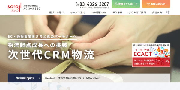 株式会社スクロール360は、通販歴35年の知見とノウハウを活かした次世代CRM物流サービスを提供しています。物流代行を始めとしたフィルフィメント業務だけでなく、ECのマーケティング支援から通販システムの開発までワンストップでサポート。これまでに750社(2022年7月調査時点)を超える通販会社の支援実績があり、クライアントのECビジネスの利益最大化に貢献します。